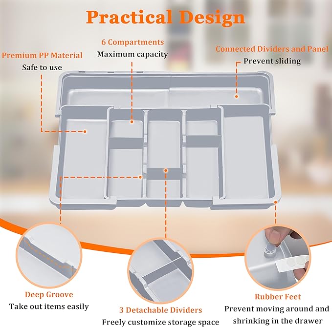 - Premium Food Grade Material: Our utensil drawer organizer is made of thick and sturdy food-grade PP material, ensuring long-lasting use. It is also BPA-free, keeping your kitchen utensils safe for your family’s health.Cleaning is a breeze – simply rinse with water or wipe clean with a cloth to remove stains. Avoid using a dishwasher.