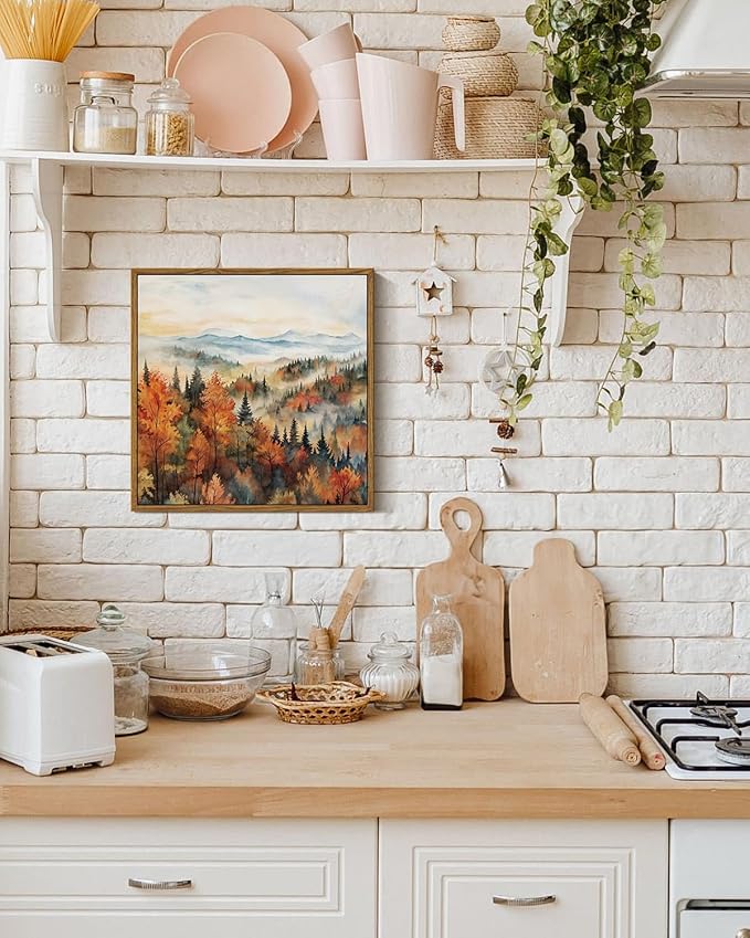 InSimSea Square Framed Canvas Wall Art, Autumn Prints Classical Landscape Pine Forest In The Morning Mist, Fall Home Wall Decor for Living Room, Bedroom, Bathroom, Office 12"x12"