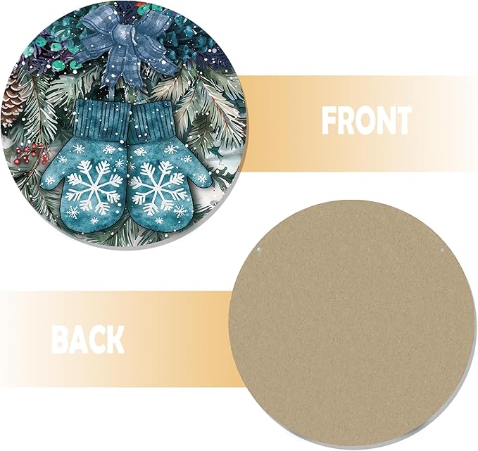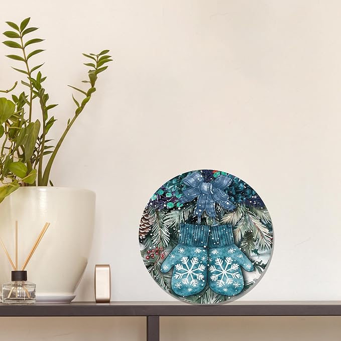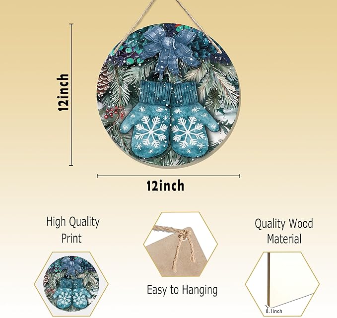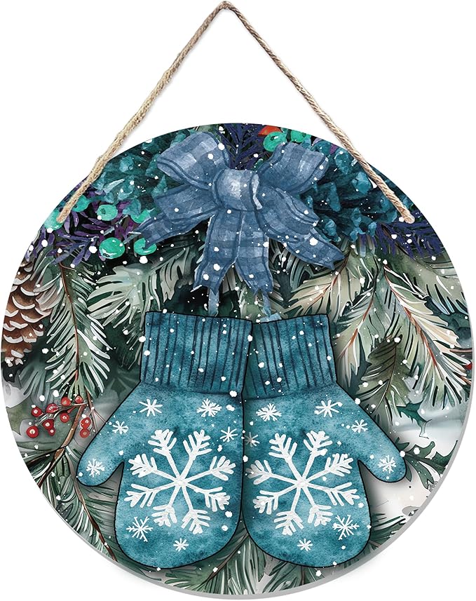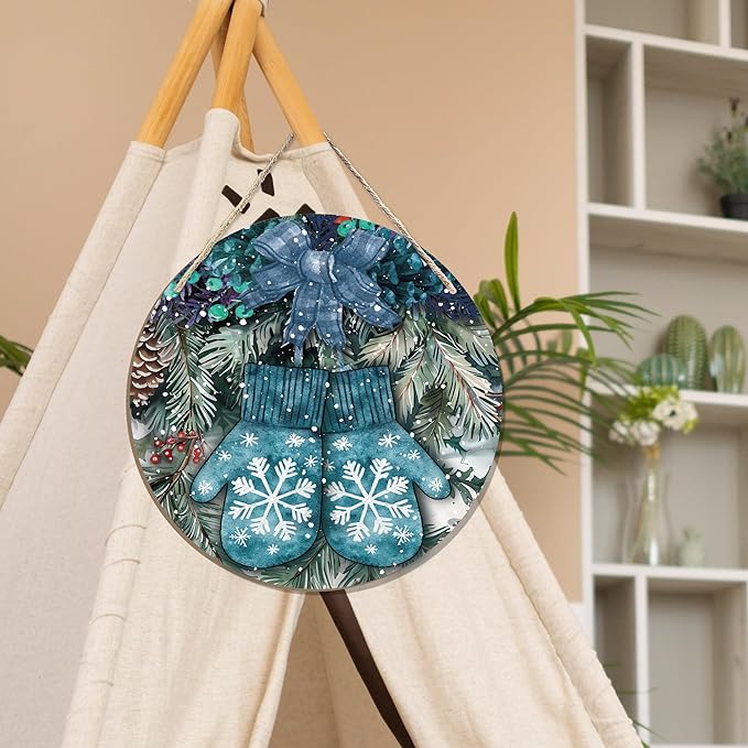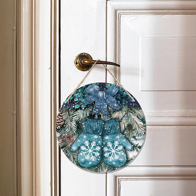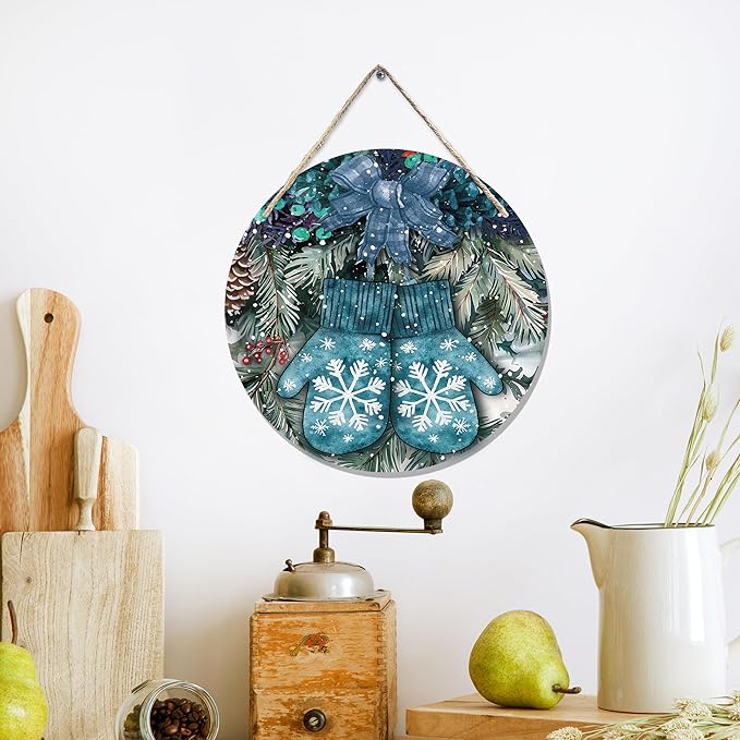 Navy Blue Winter Christmas Wooden Sign, Winter Snowflake Gloves Blue Plaid Bow Decoration Hanging Sign Wall Decor, Farmhouse Seasonal Holidays Wooden Signs for Home Door Decor 12 x 12 Inch