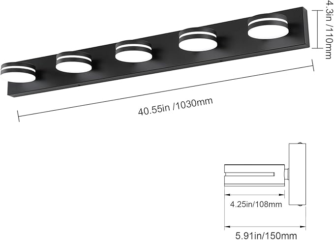 - BATHROOM LAMP SPECIFICATION : Voltage:AC100V-120V. Wattage:30 W. The matte black vanity light is 40" long * 4.33" wide and protrudes from the wall by 5.9". 360° swivel connector makes it easy to rotate individual lights to different positions as needed. This brightness is great for makeup