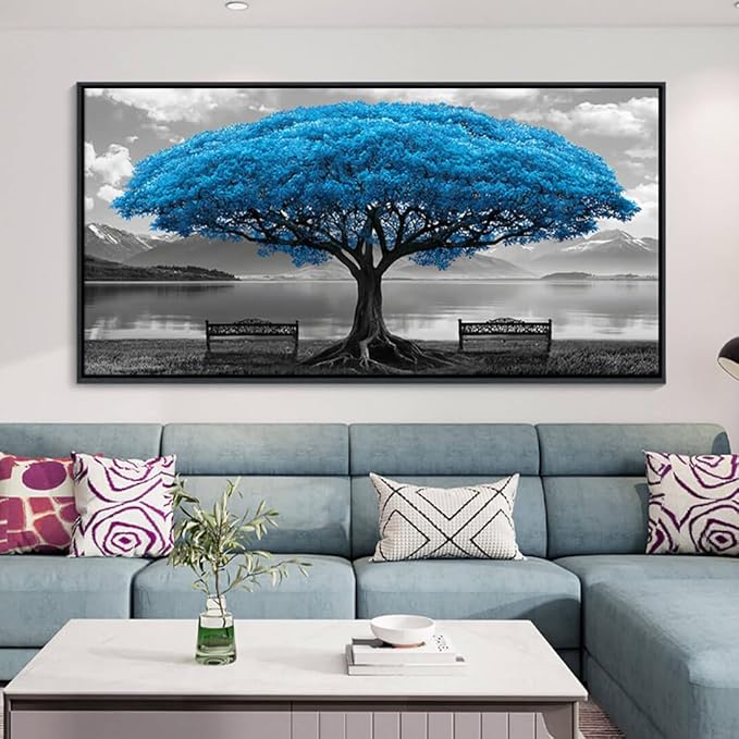 YDYSUNE Blue Tree Framed Canvas Wall Art for Living Room Large Size Wall Decor For Bedroom Black And White Pictures Lake Scenery Painting Office Decor Room Home Decoration Artwork Black Framed 29X58IN