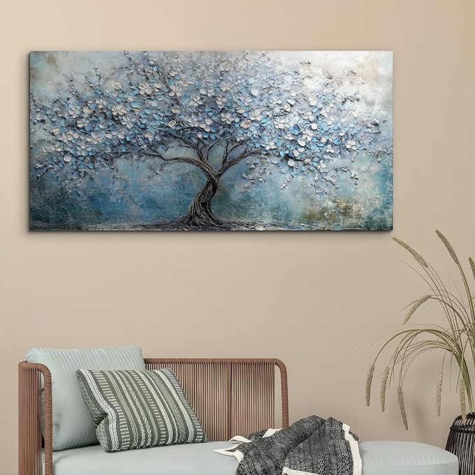 crmotu Tree of Life Large Wall Art for Living Room, Cherry Blossom Tree Abstract Art Prints Canvas Pictures, Modern Blue White Aesthetic Painting Bedroom Bathroom Home Office Wall Decor 30"X60"
