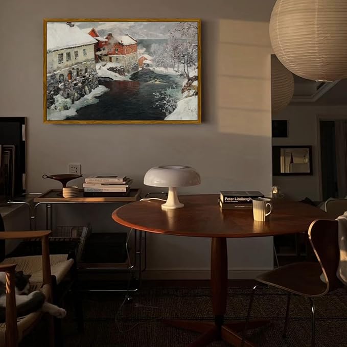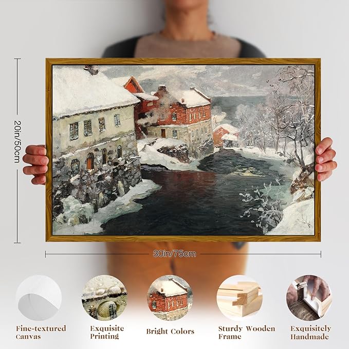 crmotu Framed Canvas Wall Art, Country Winter Scene Vintage Art Prints, Riverside Old Architecture Landscape Painting, Snow Scenery Rustic home Decor Living Room Bedroom, Farmhouse Wall Decor 20x30in