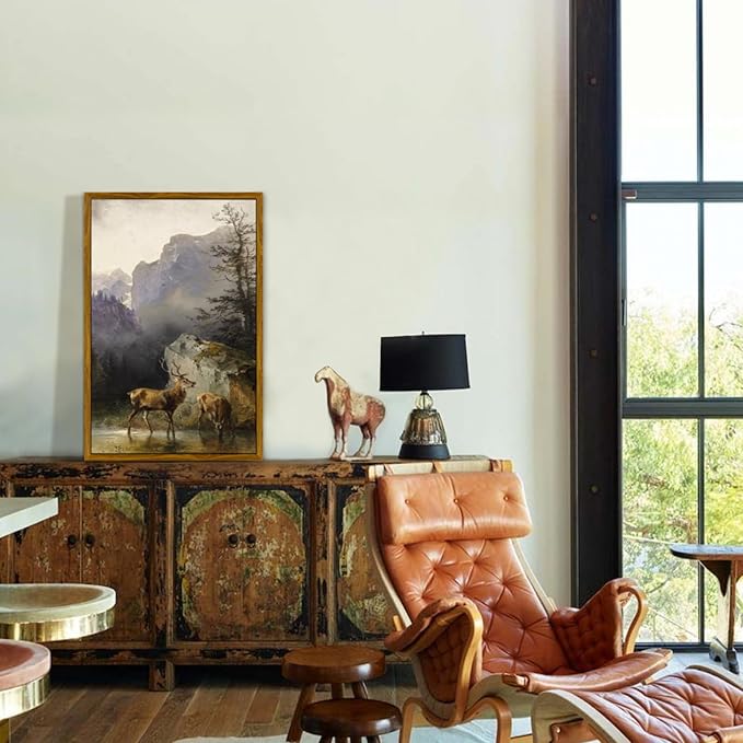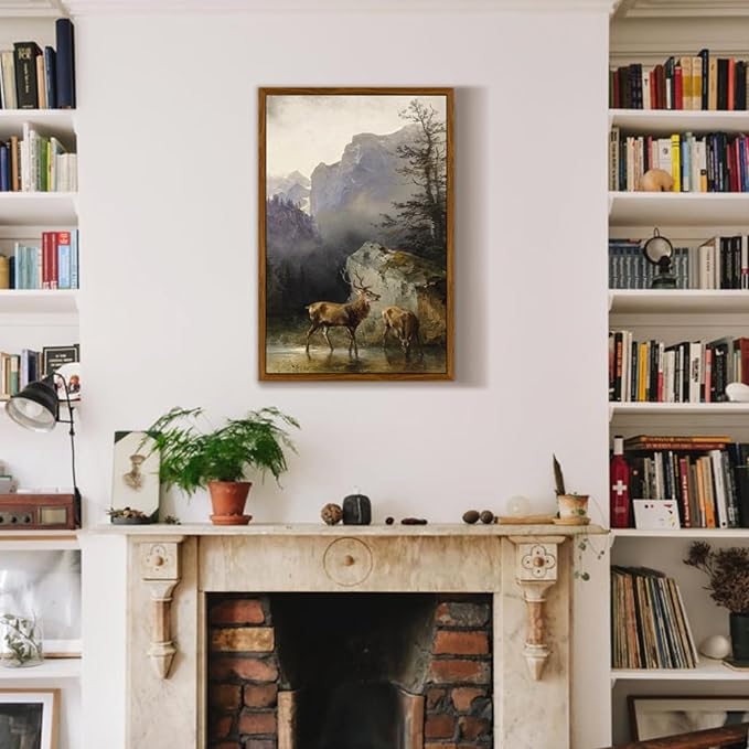 - Mountain Deers: This vintage wall art beautifully captures a scene of deer gracefully drinking by the water in the mountains, set against steep rocky peaks and a mist-shrouded forest in the background, creating a mysterious and poetic ambiance