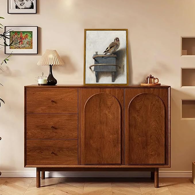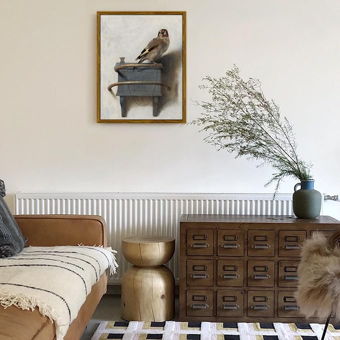 - Bird Wall Art: This still life vintage wall art beautifully depicts a goldfinch tethered by an iron chain next to its cage. Its vacant gaze draws the viewer's attention, evoking a profound sense of empathy and reflection