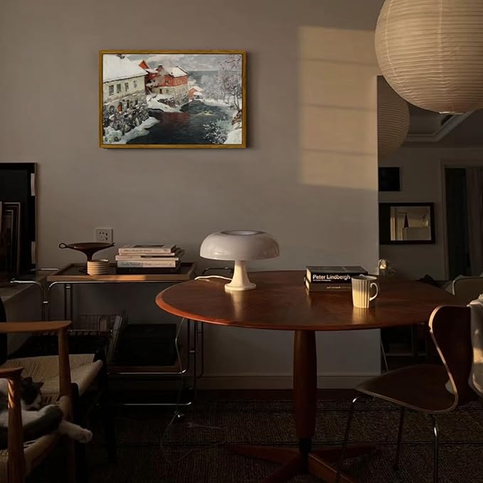 - Snowy Village: This vintage wall art showcases a winter scene along the banks of the Mesma River, where the river flows centrally into the distance, flanked by houses and bare trees in a snowy landscape, capturing a tranquil yet vibrant sense of life