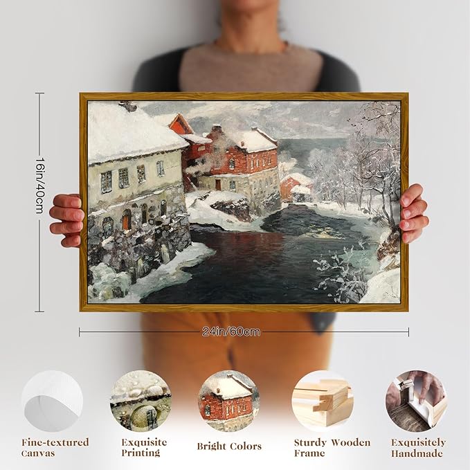 crmotu Framed Canvas Wall Art, Country Winter Scene Vintage Art Prints, Riverside Old Architecture Landscape Painting, Snow Scenery Rustic home Decor Living Room Bedroom, Farmhouse Wall Decor 16x24in