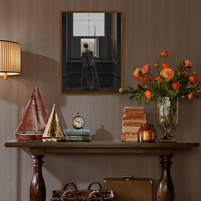 crmotu Framed Canvas Wall Art, Vintage Portrait Paintings Wall Decor, Woman by the Window Dark Art Prints, Retro Lady Back Pictures Rustic Farmhouse Home Decor Living Room Bedroom Bathroom 16x24in