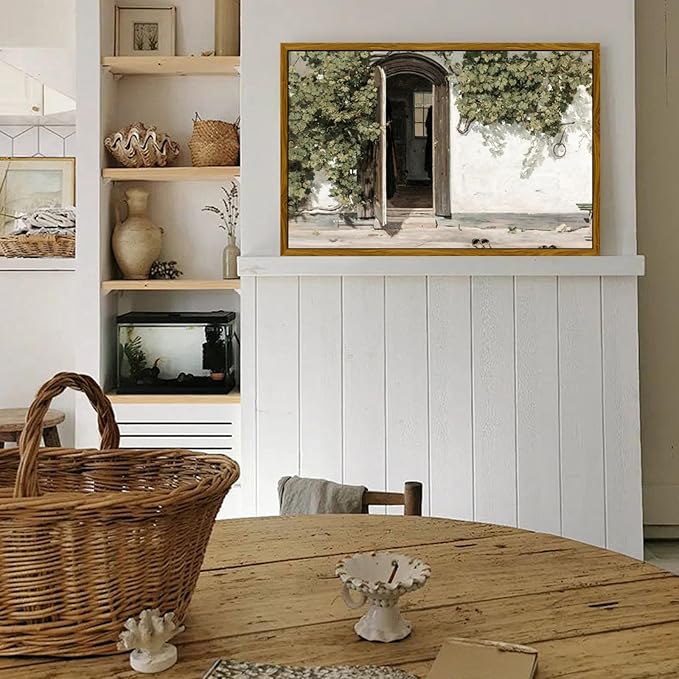 - Plant Gate: This vintage wall art depicts the entrance of a small inn, featuring an open door at the center, surrounded by lush green foliage. A bench and slippers at the doorway add a touch of life to the scene, transforming everyday moments into art