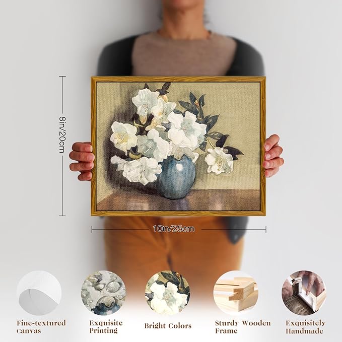 crmotu Floral Framed Wall Art, Still Life Azalea Botanical Prints, Vintage Vase White Flowers Canvas Pictures, Retro Wall Paintings for Living Room, Bedroom Kitchen Office Desktop Small Artwork 8x10in