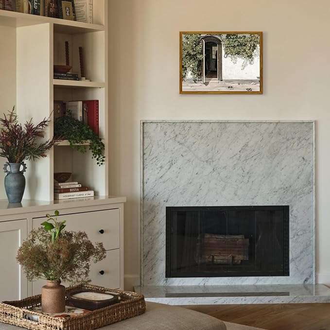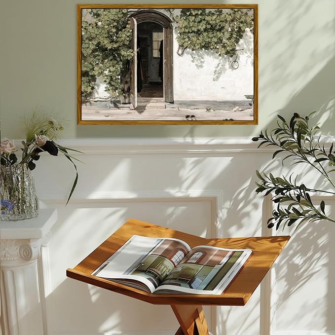 - Plant Gate: This vintage wall art depicts the entrance of a small inn, featuring an open door at the center, surrounded by lush green foliage. A bench and slippers at the doorway add a touch of life to the scene, transforming everyday moments into art
