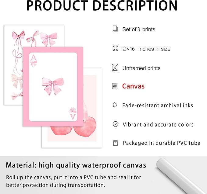 - Trendy Pink Bows Design: This charming set of 3 pink canvas prints combines elegance and playfulness, featuring delicate watercolor bows, a stylish cherry motif with ribbon accents, and a vintage-inspired Ace of Hearts card design. Perfect for creating a soft, preppy, and coquette aesthetic, these trendy wall art pieces add a feminine touch to any space. Whether for a girl’s bedroom, a living room, or a college apartment, these prints bring a fresh, lighthearted vibe to your home decor. The harmonious mix of pastel pinks and clean lines ensures they complement both modern and vintage styles effortlessly.