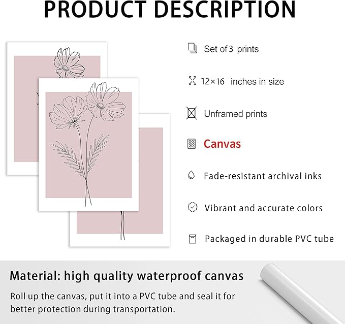 WRFON Unframed Pink Line Flower Canvas Wall Art, Light Pink Botanical Aesthetic Pictures, Minimalist Black Line Floral Poster Prints, Abstract Plants Wall Decor for Girls' Room Apartment 12"x16"x3
