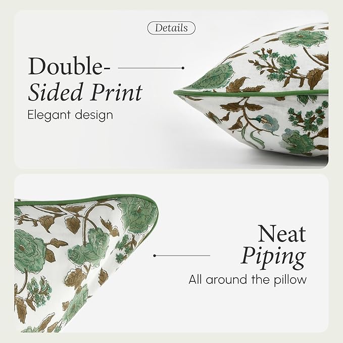 CPC 100% Cotton Throw Pillow Covers 24x24 Inch, Set of 2 Green Block Print Pattern Couch Pillow, Cute Boho Decorative Pillows for Living Room, Bedroom with Hidden Zipper- Moss Green