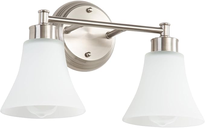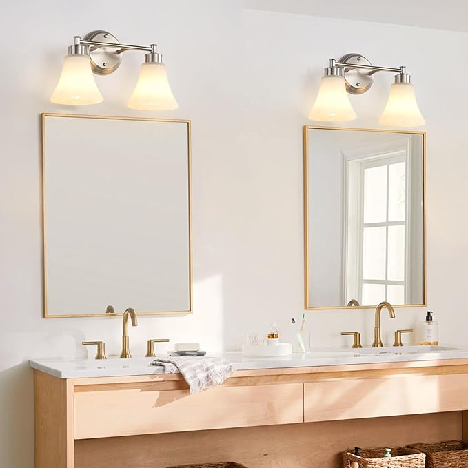 - Unique Design: LOUSACE 2 light bathroom lighting fixtures is made of brushed nickel construction, featuring the soft contemporary and mid-century modern design, the opal white glass shades soften the lights to create a gentle and elegant charm, perfectly blends with all styles decoration