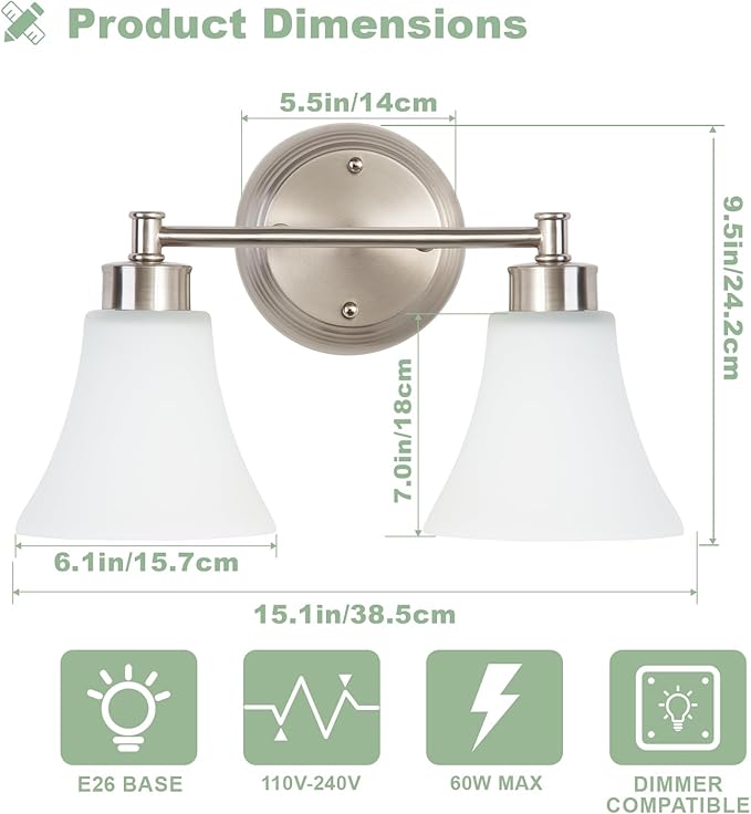 - Wide Application: The size of our 2 light bathroom vanity light fixtures brushed nickel is perfect for bathroom, bedroom, living room, powder room, dressing table, mirror cabinets, vanity table, dining room, corridor, art display, creating a warm and elegant lighting atmosphere for your space