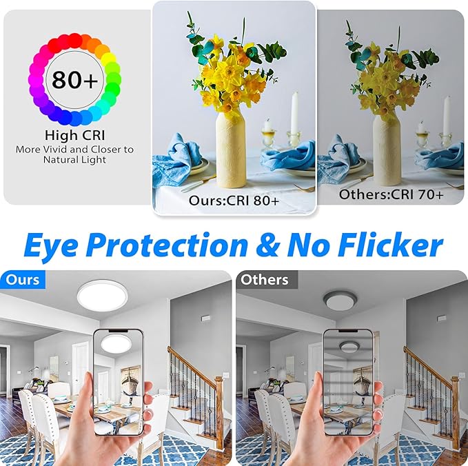 - High CRI & Eye-caring: With an impressive CRI of 85+, this round surface mount light fixture ensures that colors appear true-to-life and vibrant. Equipped with high-quality 2835 LED chips,it delivers stable,uniform,flicker-free light,significantly reducing eye strain and promoting comfortable viewing