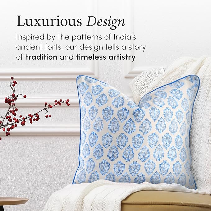 CPC 100% Cotton Throw Pillow Covers 20x20 Inch, Set of 2 Green Block Print Pattern Couch Pillow, Cute Boho Decorative Pillows for Living Room, Bedroom with Hidden Zipper- Royal Blue