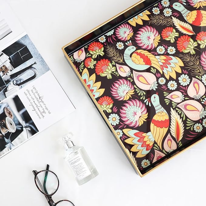 Spsyrine Decorative Serving Tray with Handles, Black Lacquered Coffee Table Tray for Ottoman, Rectangle Waterproof Platters for Centerpieces, Parties, Living Room, Kitchen Counter Organization Peacock
