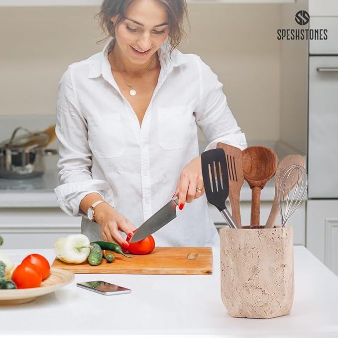 - MATERIAL - Crafted from natural travertine stone, this kitchen utensil holder is built to last. Perfect for organizing cooking utensils, stone spoons, wooden spatulas, and kitchen tools while adding a rustic, elegant touch to your kitchen countertop. Perfect for gifting to chefs or home cooks.