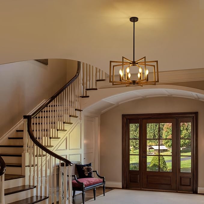 8-Light Modern Farmhouse Chandelier, Vintage Geometric Dining Room Lighting Hanging, Industrial Chandelier for Kitchen Island Entryway Foyer Stairway, Retro Wood Texture and Black Finish
