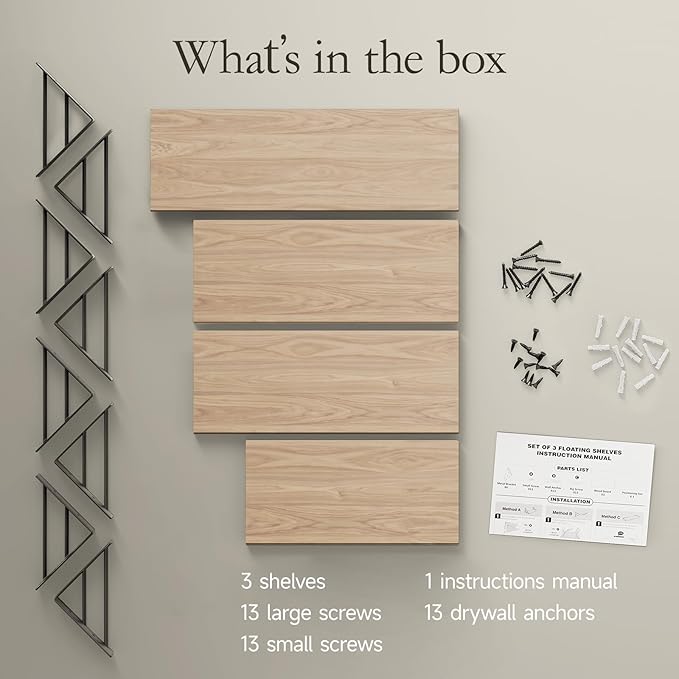 - **Three different size Floating Shelves for All** : Large: 16.5 × 5.5 × 4.6 inches; Medium: 14.2 × 5.5 × 4.6 inches; Small: 11.4 × 5.5 × 4.6 inches. These floating shelves are wider and sturdier than others to safely hold collectibles, photos, small plants and showcase favorite dishes or build your own coffee bar. Easy to assemble with all necessary hardware included according to the instruction steps.