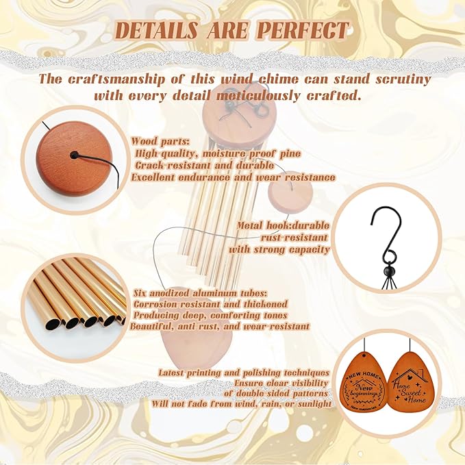 - Elegant and Gift-Ready Packaging: Packaged in a sophisticated black gift box (11.42 inches x 3.74 inches x 1.57 inches) with double-layer foam and black flocked interior, this new home gift is ready to be gifted. Crafted with moisture-resistant pine wood and durable, rust-proof aluminum tubes, this housewarming wind chime is designed to last. The etched pattern and message are enduring, symbolizing lasting wishes for joy and harmony
