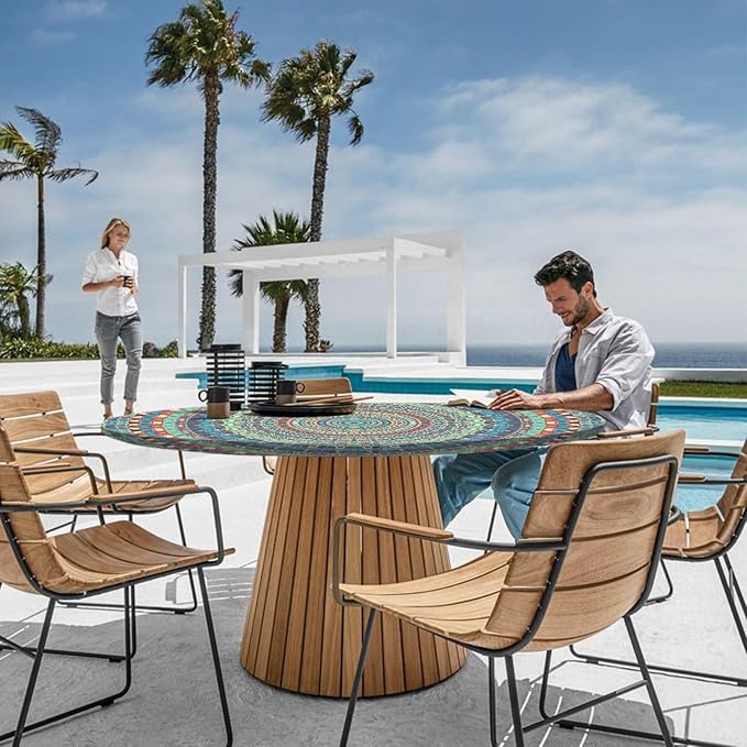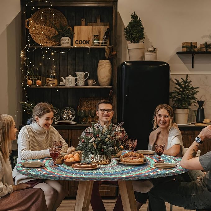 Boho Vinyl Round Tablecloth Waterproof Fitted Table Cloth Summer Fall Outdoor Circle Cover for 36-44" Tables Kitchen Dining Apartment Essentials Picnic Camping Party Decor Housewarming Gifts