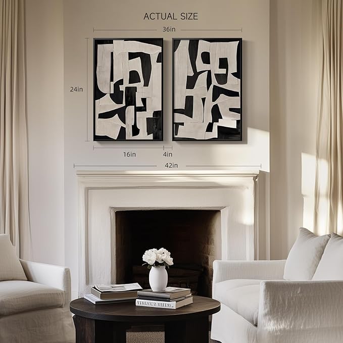 - [Abstract Wall Art]: The paintings using an abstract design with simple and versatile black and off- white, the sharp color contrast and irregular patterned layout create a strong visual effect, enough to become the focal point of the space, perfect for decorating the living room, corridor, stairwell, dining room, bedroom, study, kitchen, office and bathroom, adding a modern and artistic touch to any space