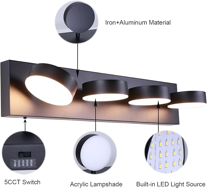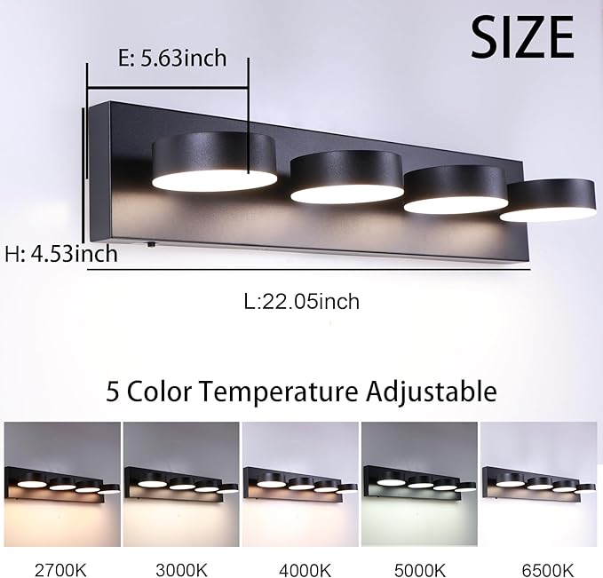 - 5 Color temperature adjustable: Bathroom light fixtures come with 5 color temperature 6500K(cool light), 5000K(white light), 4000K(neutral light), 3000K(warm light), 2700K(yellow light) choose your color to create the perfect lighting atmosphere