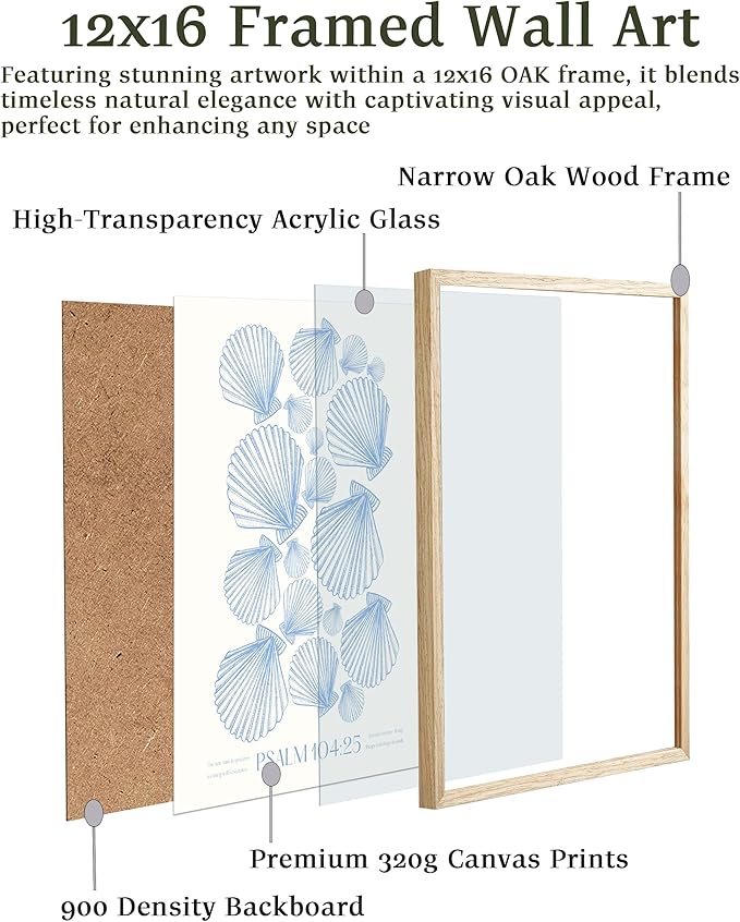 - High-Quality Canvas: Printed on premium 320G canvas, this wall art ensures vibrant colors and clear details, allowing both the scripture and seashell illustrations to stand out beautifully.