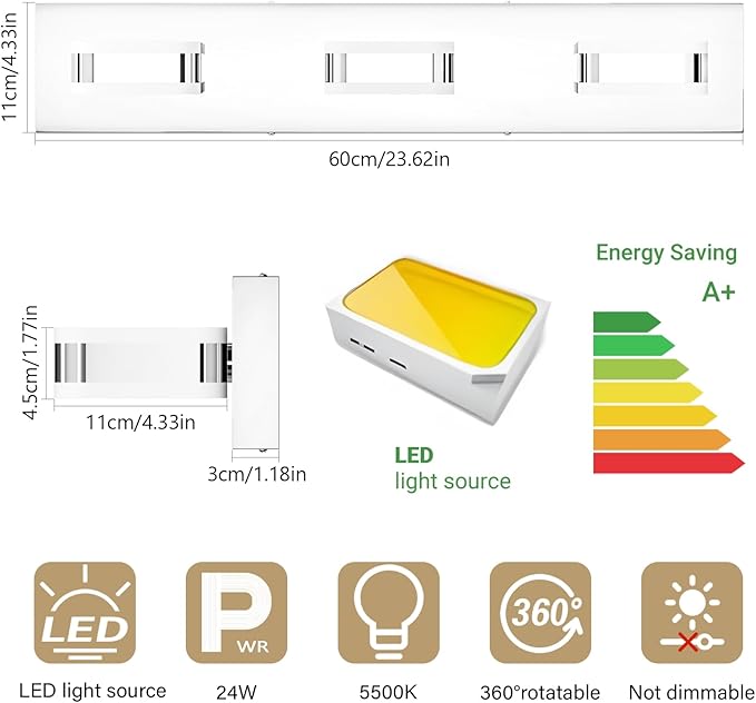 - [Energy Saving]:This 24W LED cool white vanity light provides a brightness that surpasses a traditional 120W bulb,offering exceptional light efficiency. It’s both environmentally friendly and energy-saving,using up to 80% less electricity compared to traditional bulbs. With a long service life of up to 50,000 hours,the integrated LED technology reduces energy costs while delivering reliable, high-performance lighting that is both durable and economical.