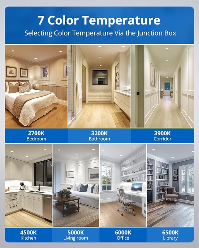 - 7 Color Temperature Selectable: 7CCT options (2700K, 3200K, 3900K, 4500K, 5000K, 6000K, 6500K) with switching, perfectly match any room or activity. No more guessing which color temperature to pick!