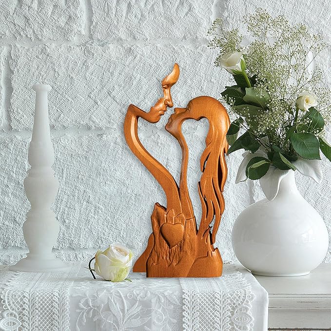Wooden Kissing Couple Ornament, Abstract Couple Portrait Sculpture Romantic Love Statue Decor Gift for Women Anniversary Valentine Wedding - 14 Inch