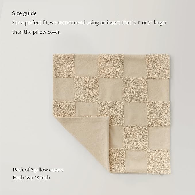 Double Stitch Checkered Throw Pillow Covers - 100% Cotton Set of 2 Tufted Boho Decorative Pillow Covers 18x18, Made in India, Square Cushion Case, Modern Home Decor for Couch, Sofa, Living Room, Oat