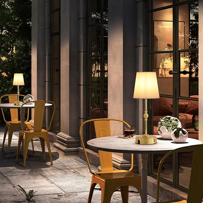 - [Antique Brass Portable Cordless Design]This is a practical gold cordless led table lamp with sleek simple modern classic design,The cordless LED desk lamp has a built-in rechargeable battery of 10000Amh,which ourdoor table lamp can last for up to 48 hours (at the lowest brightness setting) after each charge.Due to battery lamps portability,rechargeable and durability,Patio Table Lamp can be used as an emergency light in case of sudden power outages.Whether indoors or outdoors,USB rechargeable bedside lamp is the best warm battery opreated lamp that combines functionality and decoration.