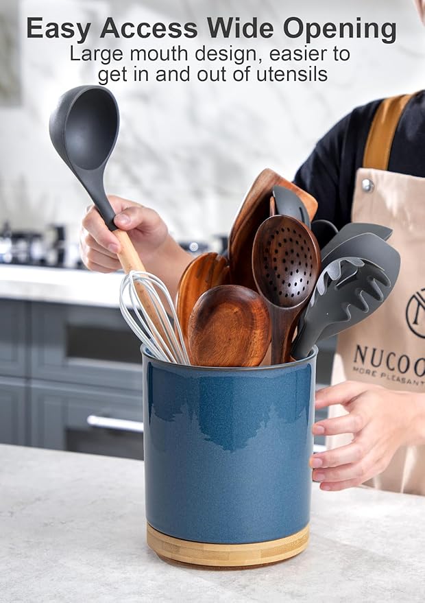 Nucookery 360°Rotating Utensil Holder, 7.2" Kitchen Utensil Crock, Ceramic Cooking Utensil Organizer with Countertop-Protection Cork Bottom for Farmhouse Kitchen Decor Christmas (Royal blue)
