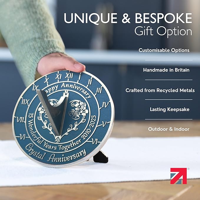 - HANDMADE IN THE UK - With high quality thick aluminum, our craftsmen combine simplicity, elegance and durability into every single sundial. And for this 15th wedding anniversary version, they finished it in blue. Some may say it’s a bold choice, we say a well-deserved choice. After all, 15 years is something to shout about.