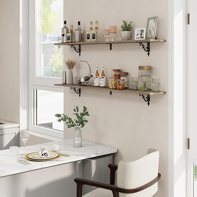 - Perfect Home Decor: This wood shelf fits rustic style, or vintage style home decor, rustic wood grain and exquisite S-shaped brackets will make your home full of modern and elegant romance. Our floating shelf makes full use of the wall, and let your room and bathroom look so cute