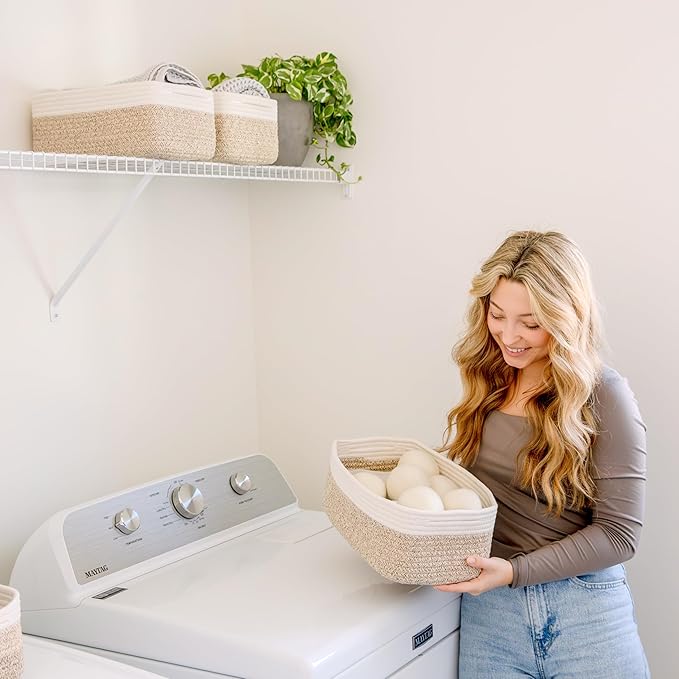- Safe, Natural Cotton Organizer Bins: Crafted from the highest quality material in the market, our storage bins are oh-so-sturdy (and cute) and ready to take on little humans. They’re 100% safe, so you can rest easy if teething toddlers take a nibble. Reinforced Hidden Handles: Now you see ‘em, now you don’t! With completely hidden handles that blend seamlessly into the rope basket, you’ll be the Houdini of home organizing. They’re even double-stitched and reinforced for extra heavy loads!