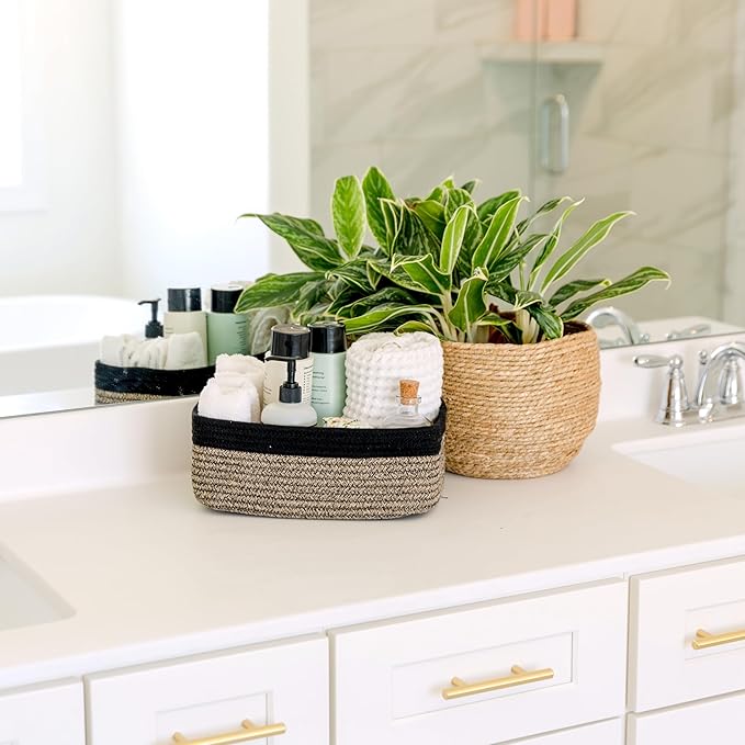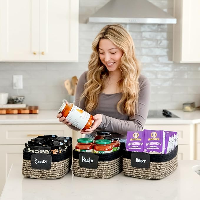 - Safe, Natural Cotton Organizer Bins: Crafted from the highest quality material in the market, our storage bins are oh-so-sturdy (and cute) and ready to take on little humans. They’re 100% safe, so you can rest easy if teething toddlers take a nibble. Reinforced Hidden Handles: Now you see ‘em, now you don’t! With completely hidden handles that blend seamlessly into the rope basket, you’ll be the Houdini of home organizing. They’re even double-stitched and reinforced for extra heavy loads!