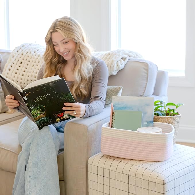 - Safe, Natural Cotton Organizer Bins: Crafted from the highest quality material in the market, our storage bins are oh-so-sturdy (and cute) and ready to take on little humans. They’re 100% safe, so you can rest easy if teething toddlers take a nibble. Reinforced Hidden Handles: Now you see ‘em, now you don’t! With completely hidden handles that blend seamlessly into the rope basket, you’ll be the Houdini of home organizing. They’re even double-stitched and reinforced for extra heavy loads!