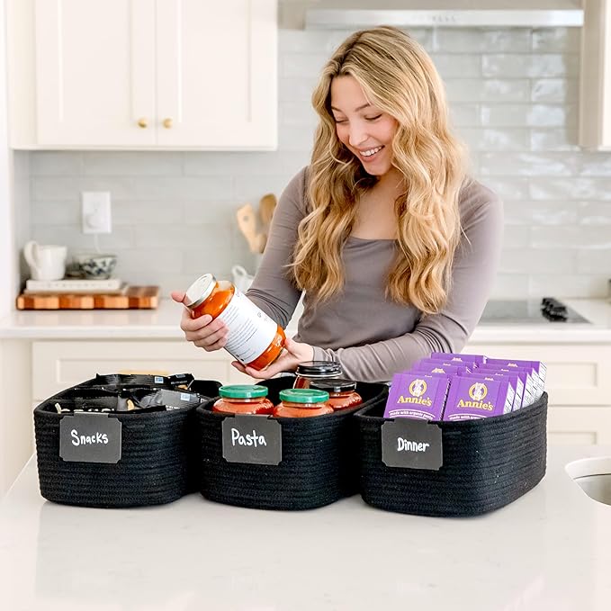 - Safe, Natural Cotton Organizer Bins: Crafted from the highest quality material in the market, our storage bins are oh-so-sturdy (and cute) and ready to take on little humans. They’re 100% safe, so you can rest easy if teething toddlers take a nibble. Reinforced Hidden Handles: Now you see ‘em, now you don’t! With completely hidden handles that blend seamlessly into the rope basket, you’ll be the Houdini of home organizing. They’re even double-stitched and reinforced for extra heavy loads!