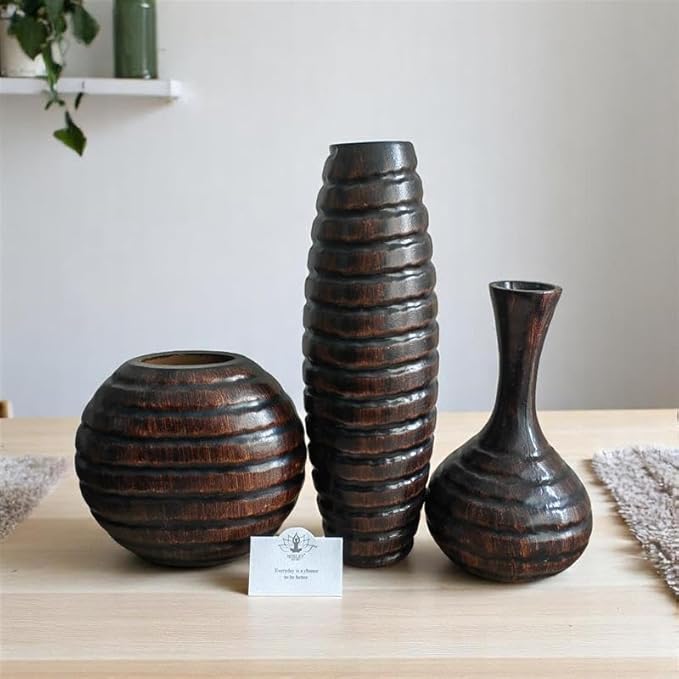 Hosley's Set of 3 Carved Wood Vases Small 6" Medium 8" and Tall 12" High. Ideal Gift for Floral Arrangements Wedding and Use for Home Office Decor Fireplace Floor Vases Spa Aromatherapy Settings