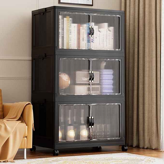 - 【Collapsible & Stackable】These plastic storage bins with wheels save space without occupying too much floor area. Their stable, stackable design prevents tipping, and you can stack them to create shelves for closet storage, bathroom storage cabinet, or clothes storage.