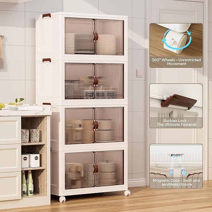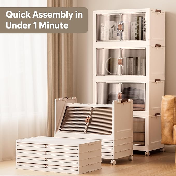- 【Collapsible & Stackable】These plastic storage bins with wheels save space without occupying too much floor area. Their stable, stackable design prevents tipping, and you can stack them to create shelves for closet storage, bathroom storage cabinet, or clothes storage.