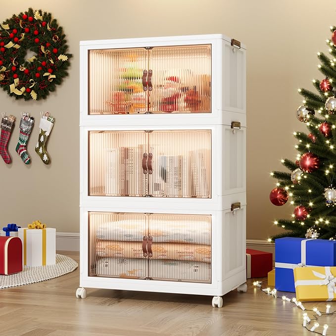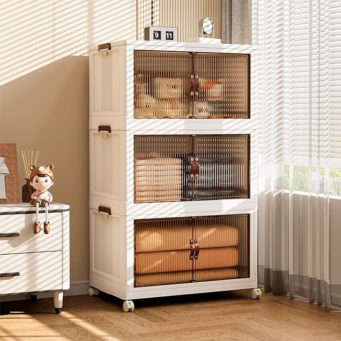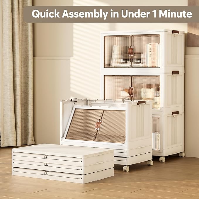 - 【Collapsible & Stackable】These plastic storage bins with wheels save space without occupying too much floor area. Their stable, stackable design prevents tipping, and you can stack them to create shelves for closet storage, bathroom storage cabinet, or clothes storage.