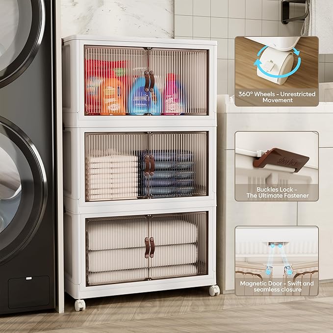- 【Magnetic Doors & Rotating Wheels】The bins offer two opening options: front or top. The magnetic closure allows easy access. The 4 rotating 360-degree wheels make them easy to move, ideal for use in storage containers and closet organization in any room like your closet or bathroom.