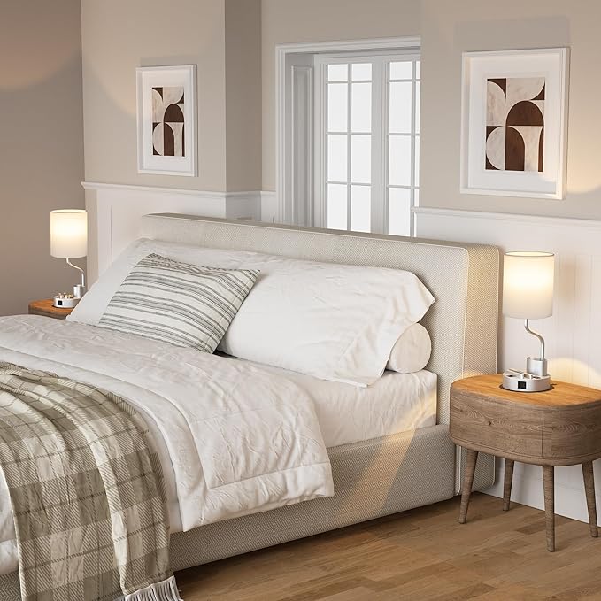 - 4. Plug and Play Modern Bedroom Lamps Set: With a unique grey base and a classic white shade, this night stand lamp complements any decor. Its modern stylish design is perfect for both home and office settings, blending effortlessly with various styles and color schemes. An ideal tableside lamp for bedroom, guest room, living room, study room, kids room, college dorm room for girls and boys, office room, desk, etc