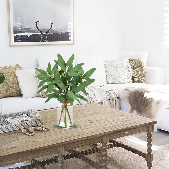 - GREEN ARTIFICIAL EUCALYPTUS: Add some life to your decor with these artificial eucalyptus leaves stems in vase! The leaves are made from premium-quality silk with plastic wired stems, and they boast realistic-looking, intricate vein detailing. These fake leaves mimic the look, feel, and texture of real eucalyptus leaves, and the frosted green color is perfect for adding a touch of nature to any space.